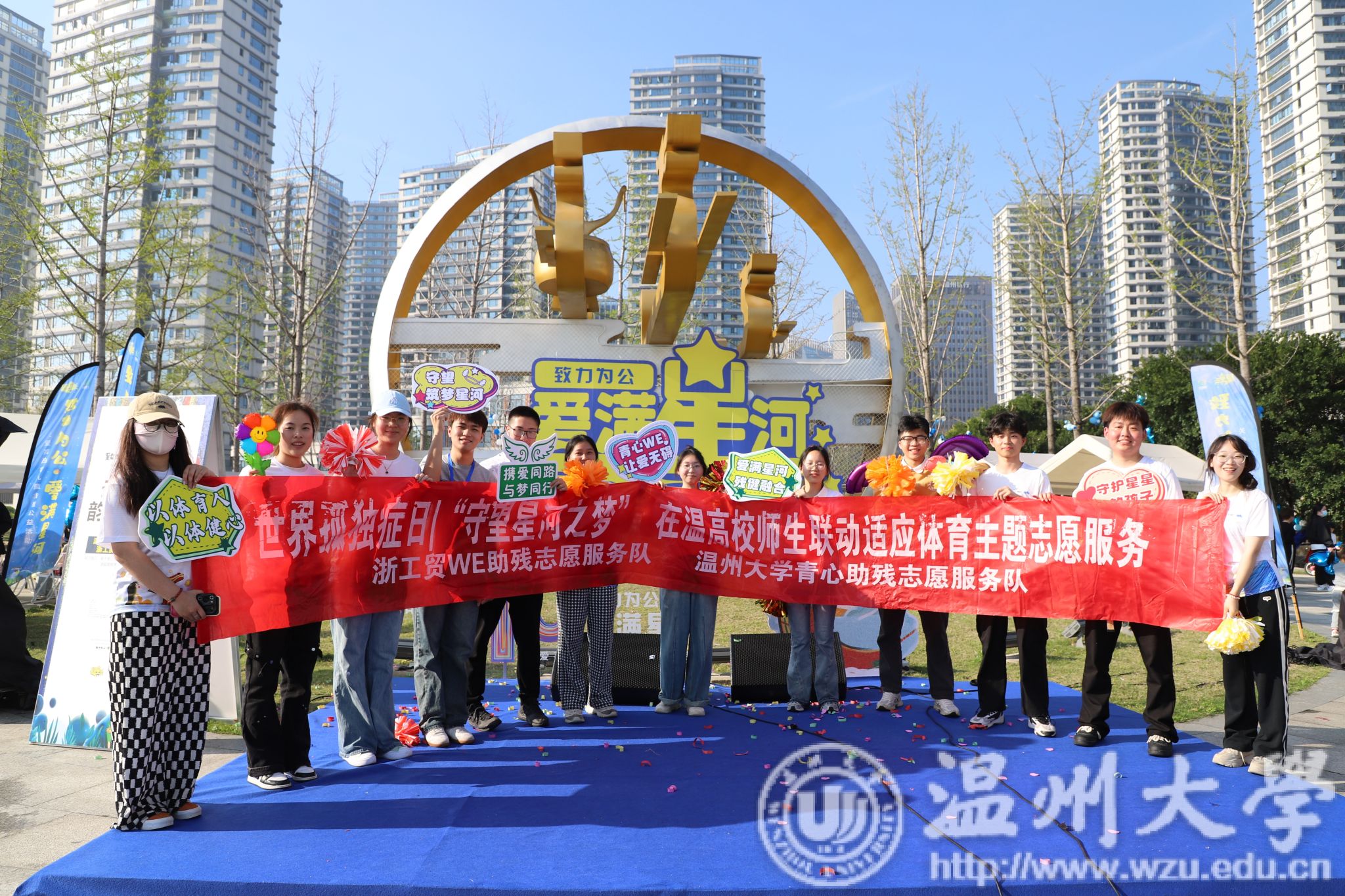 3月30日,在第十七个“世界孤独症关注日”来临之际,由益起行组织发起的“致力为公,爱满星河”关爱孤独症儿童大型公益活动现场,大学生助残志愿服务队在温州市龙舟运动中心,给300户孤独症家庭提供韵律啦啦操课堂体验。