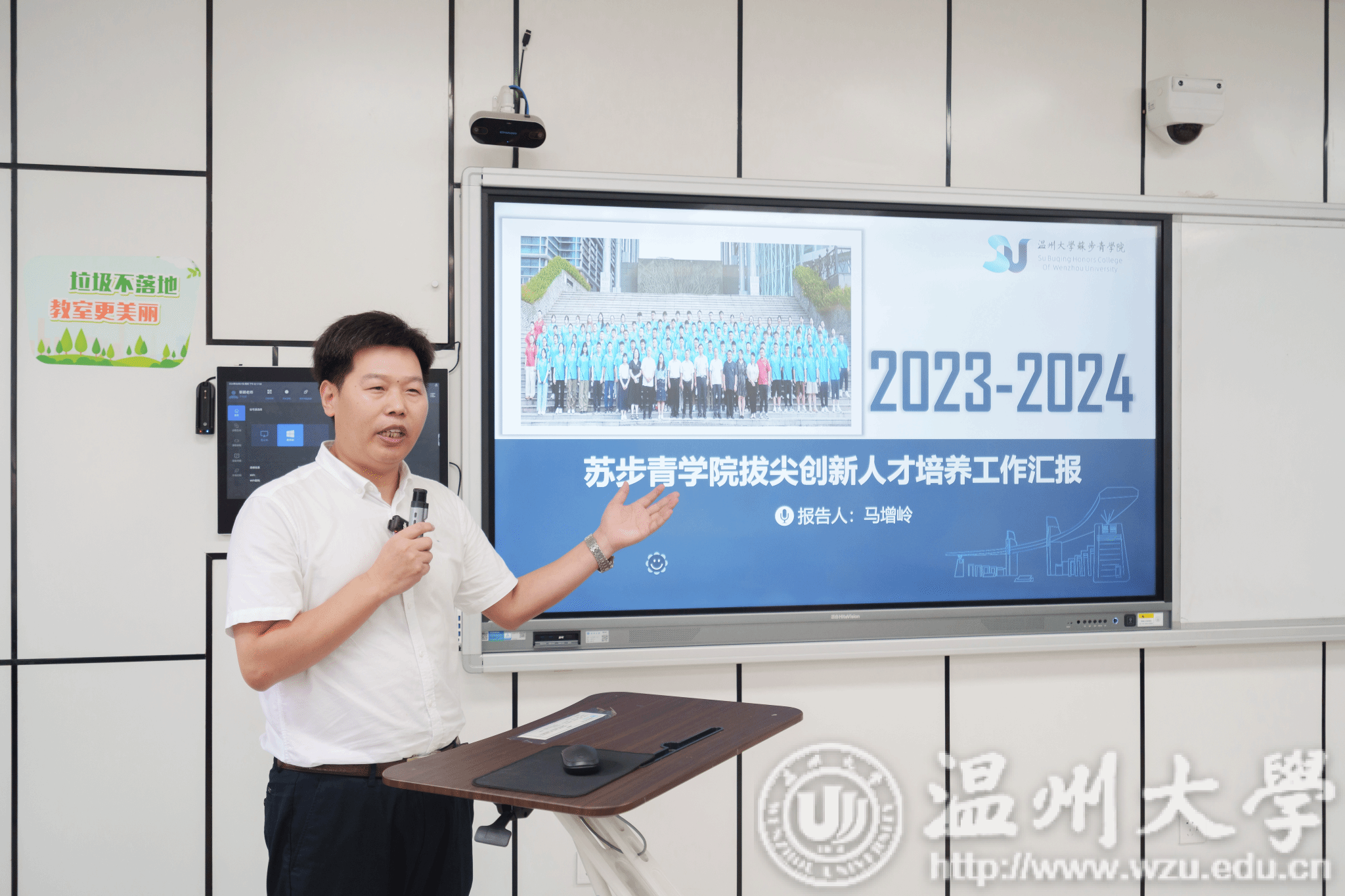 紧接着,马增岭院长做学院工作介绍。他全面回顾了学院在教学、科研和学生管理等方面取得的显著成绩,并强调学院在拔尖创新人才培养中积极弘扬步青精神。他提到,步青精神不仅代表了坚韧不拔、勇攀高峰的学术追求,也是对美的追求和对社会责任的担当。学院将继续深化美育思政课程,将其融入步青精神的培养中,帮助学生形成健全的人格和正确的价值观。