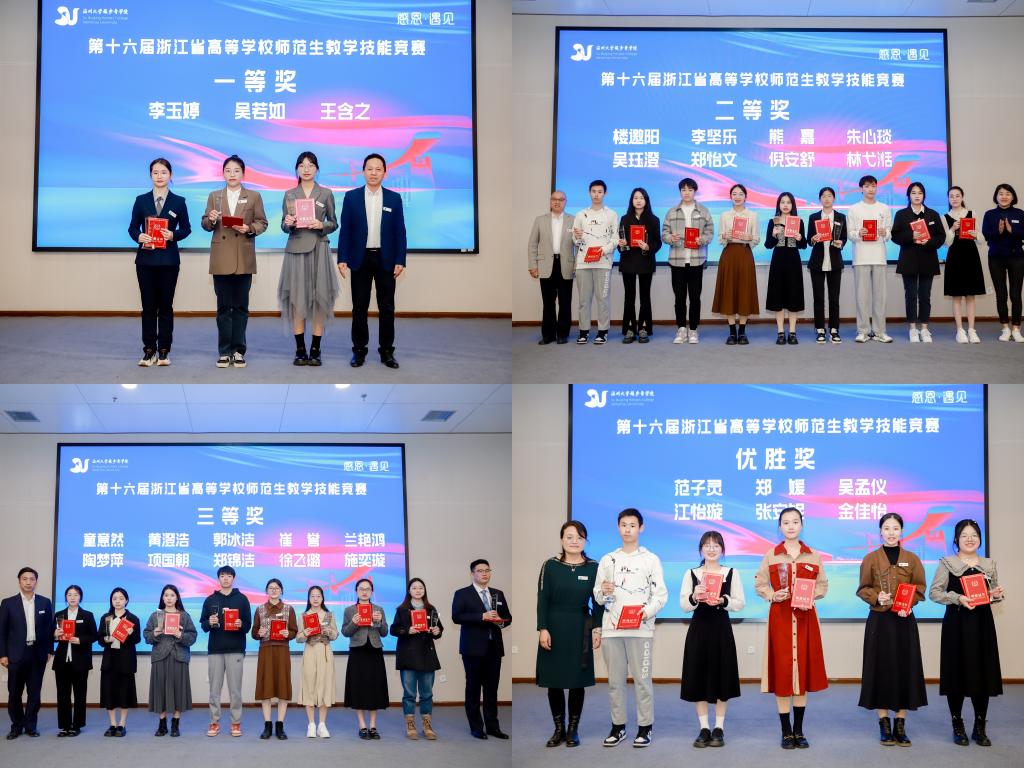 随后,典礼启动第十六届浙江省高等学校师范生教学技能竞赛颁奖仪式,获奖选手在激昂的音乐声中依次上台领奖,从老师们手中接过获奖证书和奖杯,并合影留念。