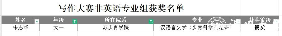 的大一新生,第一次参加外研社的比赛就获得了非英语专业组阅读大赛金奖,写作大赛铜奖。朱志华同学表示,很荣幸能获得这次阅读大赛校赛的金奖。高考结束后,他坚持学习英语,并无任何松懈,针对此次校赛,他进行了系统复习,认真备赛,成绩斐然。