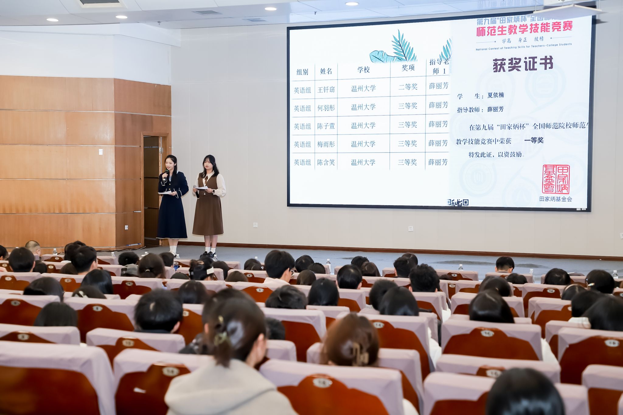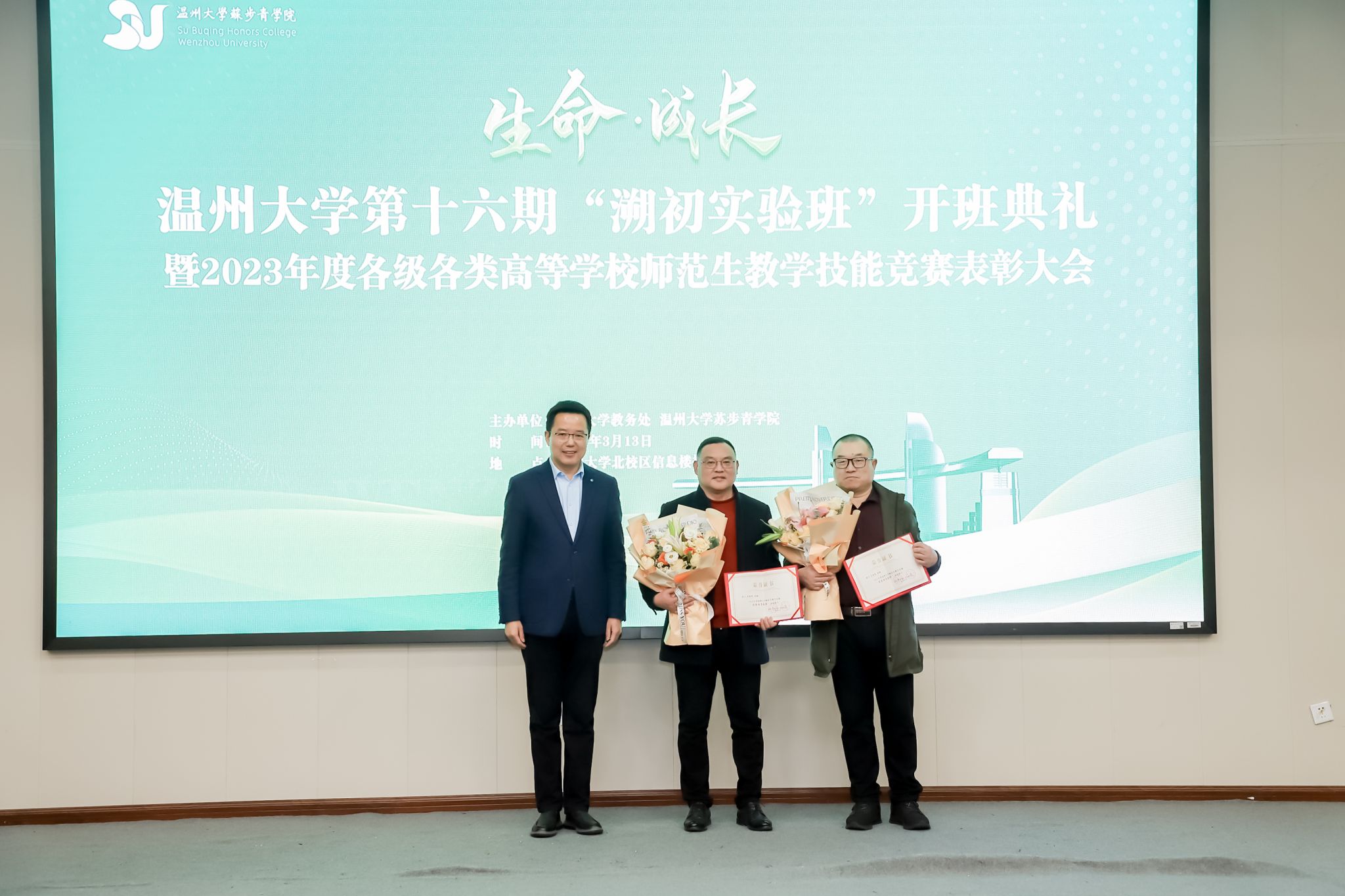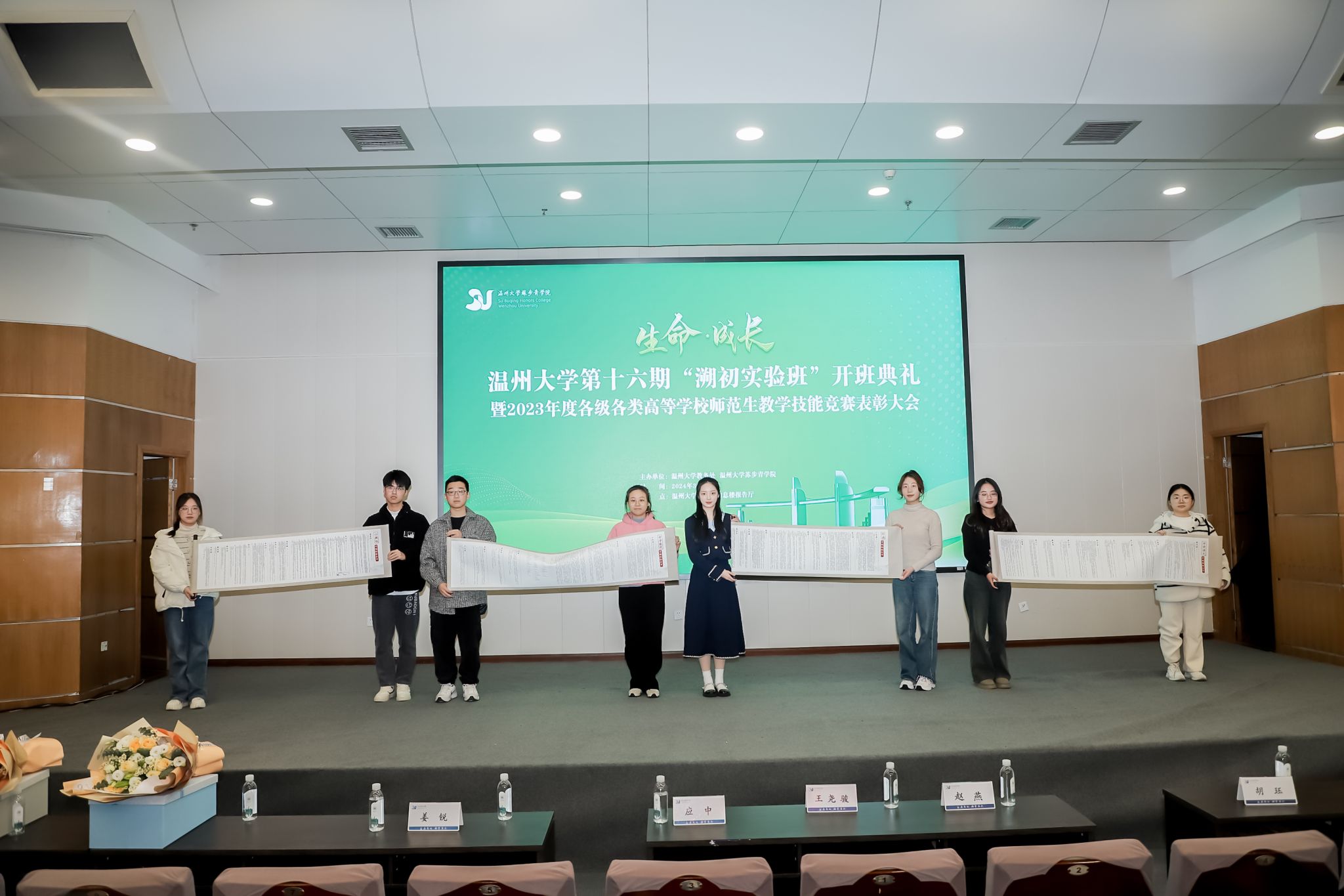 在2023年各级各类师范生教学技能竞赛中取得的辉煌成就。这些优秀的师范生们凭借扎实的专业知识、精湛的教学技能,在竞赛中脱颖而出。大屏幕上滚动播放着获奖名单,每一个名字都闪耀着荣誉的光芒,这不仅是对老师们辛勤指导的肯定,更是对第十六期溯初班成员传承教育精神、续写教育辉煌的激励。