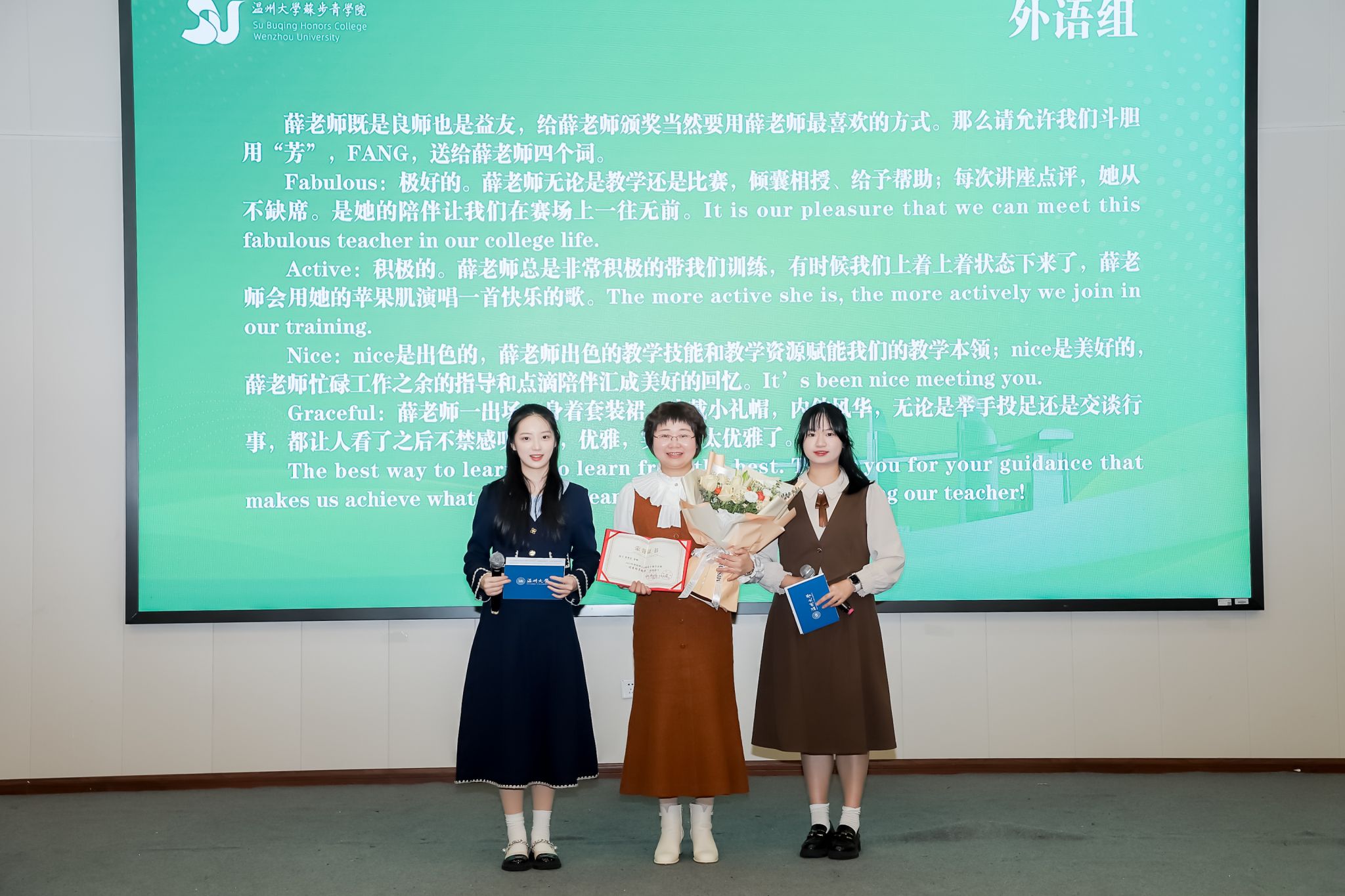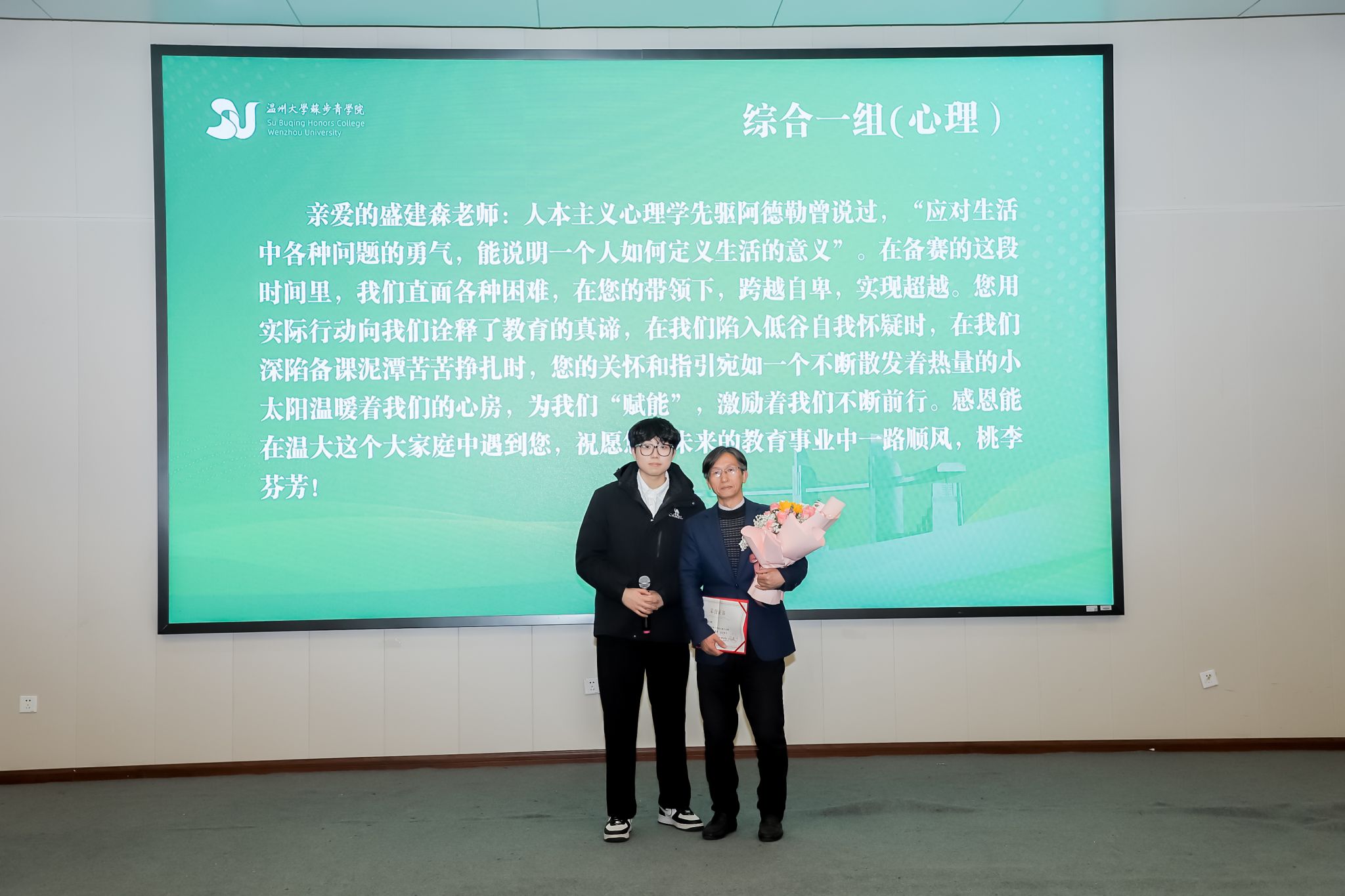 在“师长引领中成长”环节,各组选手代表依次上台,向辛勤指导的老师们表达衷心的感谢,并献上鲜花。鲜花簇拥中,师生们笑容满面,现场弥漫着浓厚的温情与敬意。这一环节不仅是对尊师重教优良传统的颂扬,更展现了师生间深厚情谊。