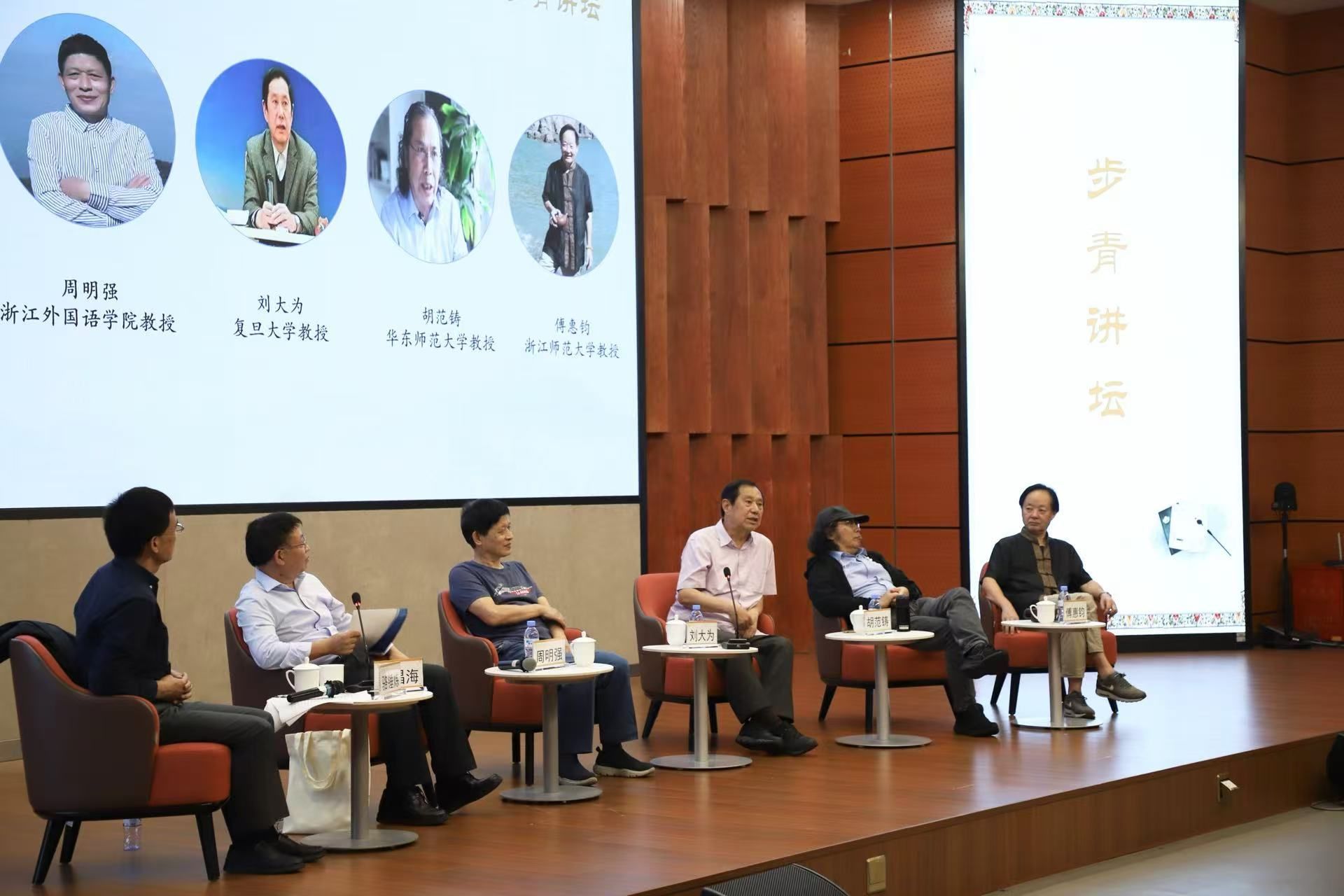通识教育中心协办。讲座由骆锤炼老师主持,复旦大学刘大为教授、华东师范大学胡范铸教授、浙江外国语学院周明强教授、浙江师范大学傅慧钧教授、浙江大学池昌海教授进行对谈,24级步青科学实验班全体新生积极参加。