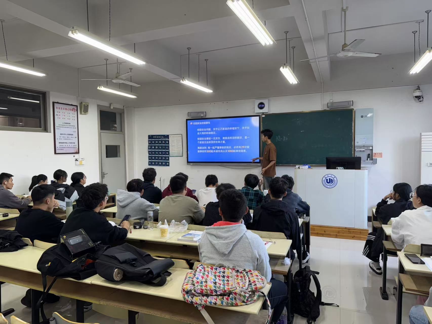 班会伊始,班长结合校园安全案例,强调校园安全的重要性。他提到,无论是财产安全、人身安全还是意识形态安全都与我们的生活息息相关。通过这些真实案例的展示,同学们意识到要注意日常生活中的细节问题,才能有效防范各类安全风险,防患于未然。