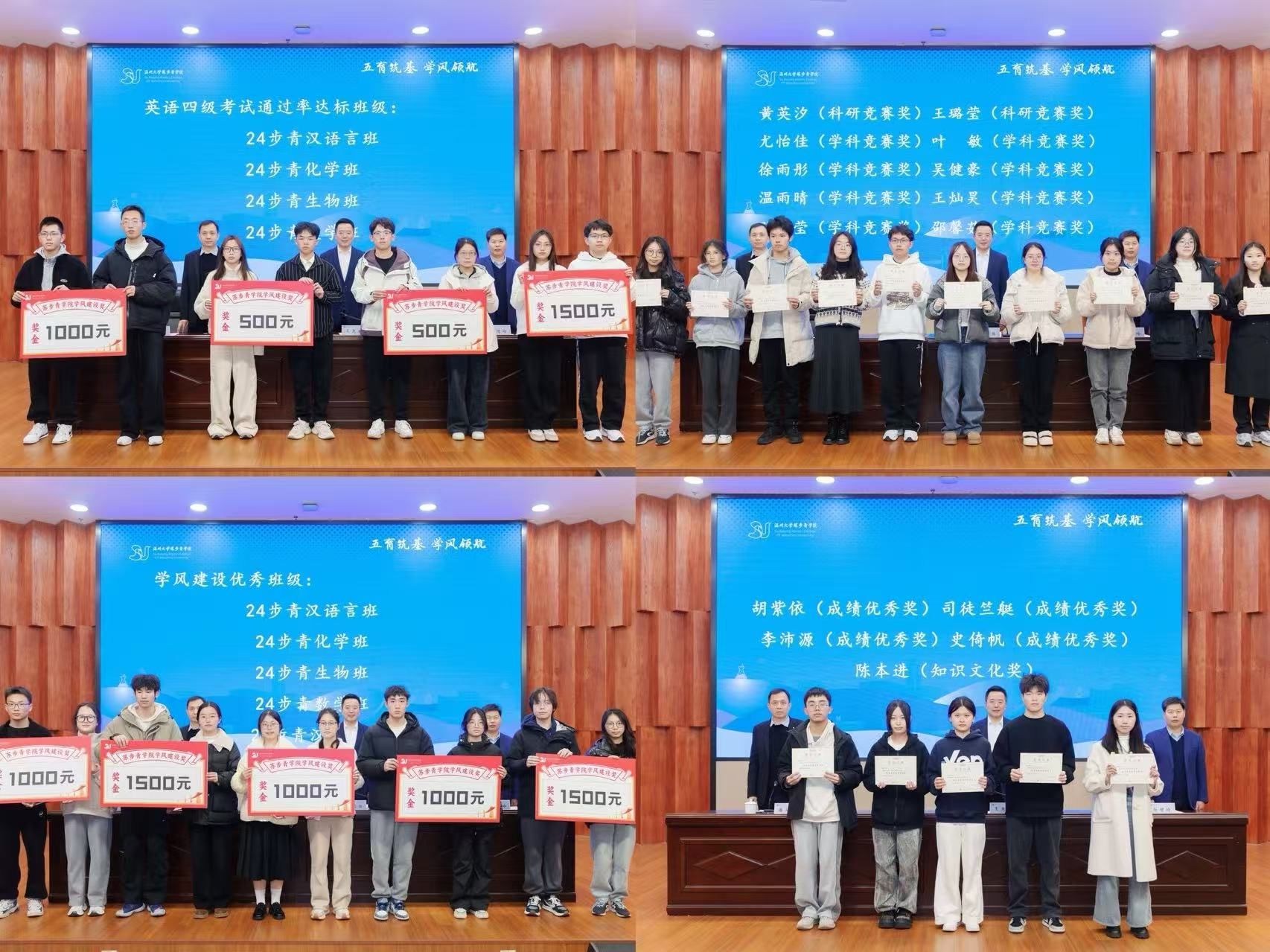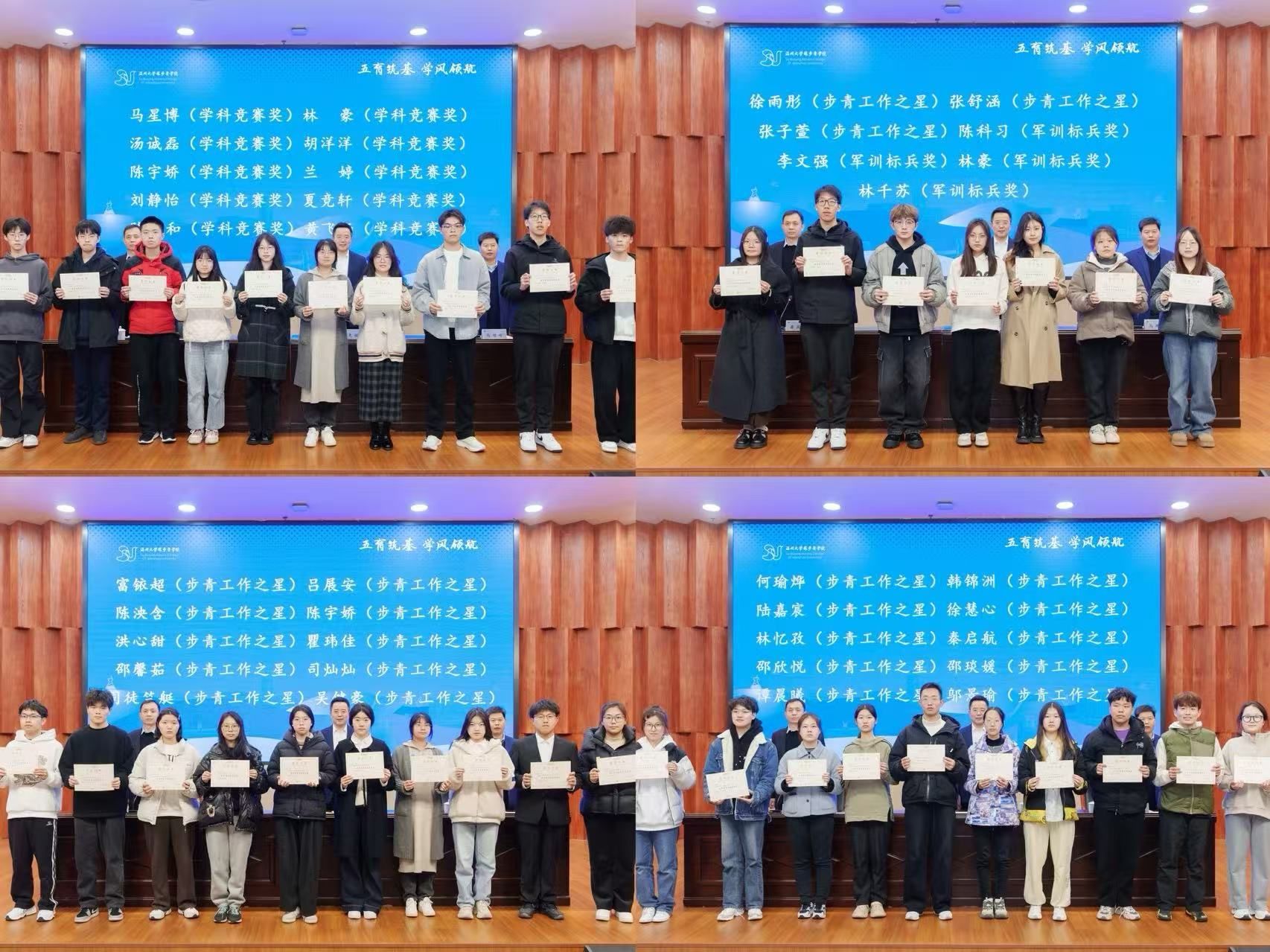 2024-2025学年第一学期学风建设表彰大会在南校区雁山厅举行。副校长王尧骏、学院执行院长马增岭、党总支书记潘从义以及学工班主任靳颖、学业导师吕宁宁、杨丝雨老师、各科室老师和全体学生参加表彰大会。大会由学院党总支书记潘从义主持。