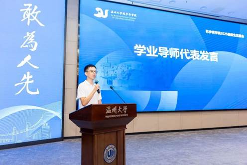 随后,学业导师代表、数学与应用数学实验班班主任蔡一常老师发言。作为清华大学本科、巴黎第十三大学博士毕业的青年学者,蔡老师结合自身经历,勉励同学们树立远大目标,保持学术热情,脚踏实地、勇攀高峰。